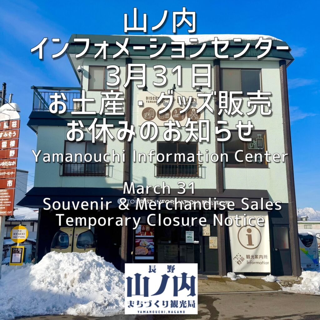 山ノ内インフォメーションセンターでは3月31日(火)は棚卸しの為お土産・グッズの販売を停止させていただきます。