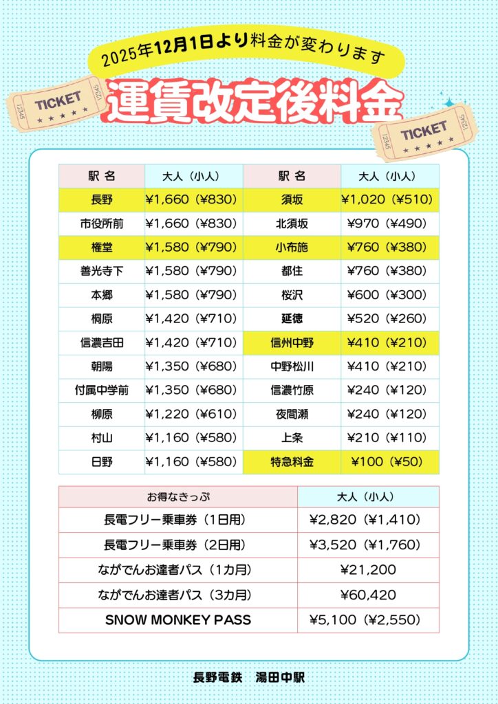 2025年12月1日より、長野電鉄の運賃が改定されます。