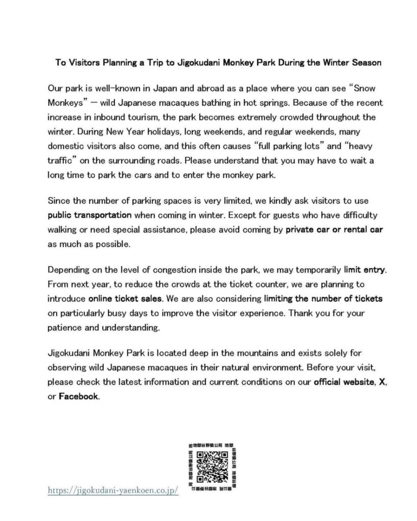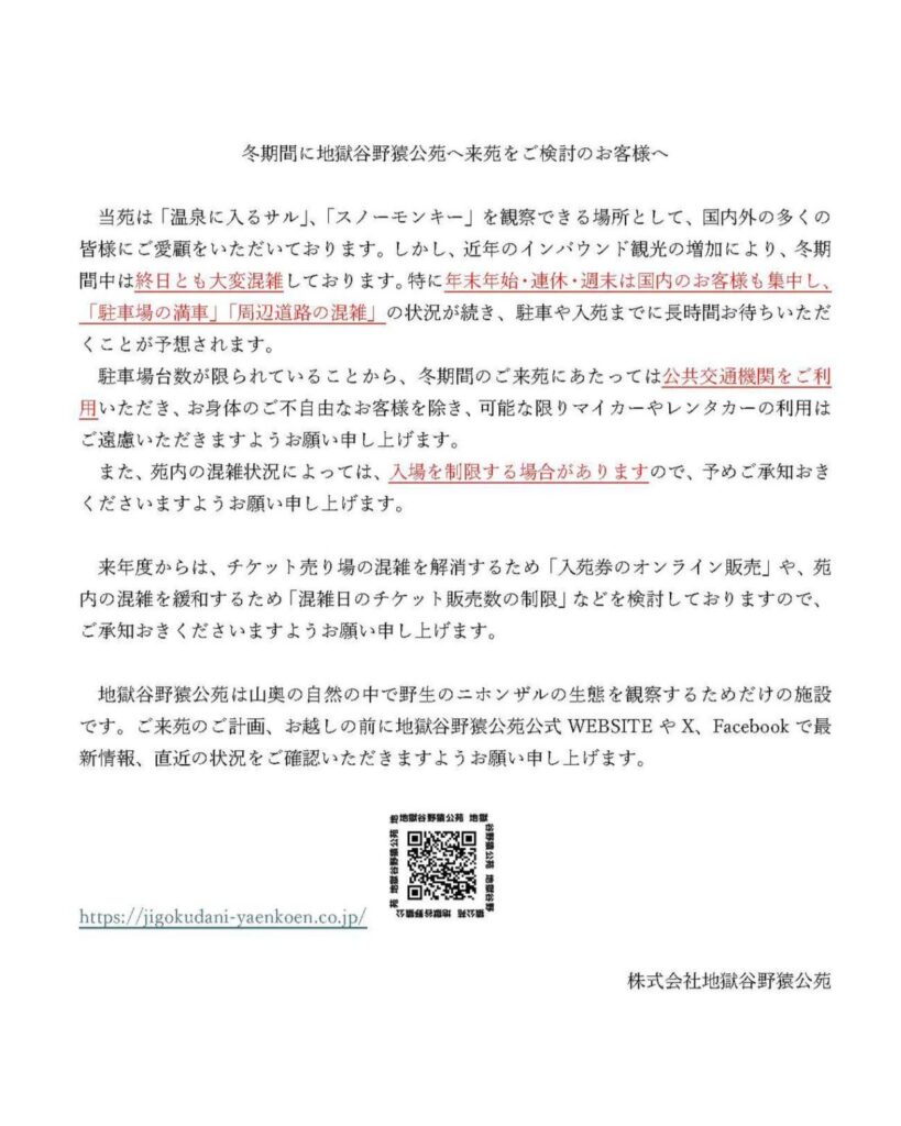 当苑は「温泉に入るサル」、「スノーモンキー」を観察できる場所として、国内外の多くの皆様にご愛顧をいただいております。しかし、近年のインバウンド観光の増加により、冬期間中は終日とも大変混雑しております。特に年末年始・連休・週末は国内のお客様も集中し、「駐車場の満車」「周辺道路の混雑」の状況が続き、駐車や入苑までに長時間お待ちいただくことが予想されます。