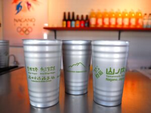 山ノ内まちづくり観光局では環境配慮型の容器として[山ノ内町オリジナルロゴ入り 飲料用アルミカップ]を作り、エキナカ山ノ内にて販売しております。
